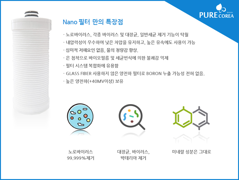 - 나노 양전하막 + Sediment - 노로바이러스, 대장균, 일반세균 제거 - 파티클 Particle, 유해 중금속 제거 - Colloid물질(Humic acid등 Bio-Film형성물질) 100%제거 - 유익한 미네랄성분은 그대로 유지