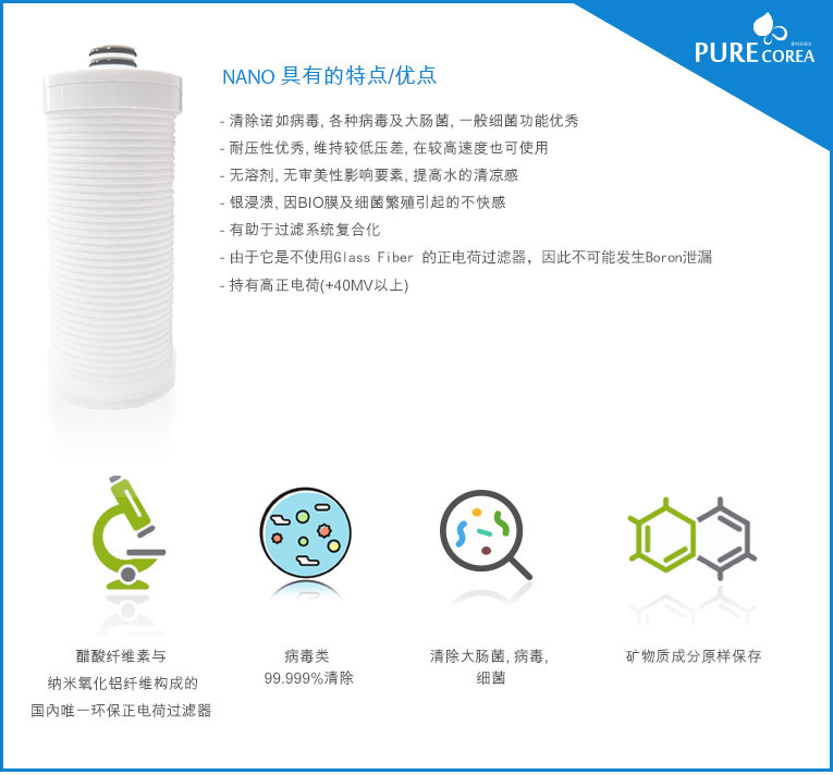 - 纳米氧化铝正电荷膜 + Sediment - 清除诺如病毒, 大肠菌, 一般细菌 - 清除粒子, 有害重金属 - 胶体物质(腐植酸等 Bio-Film形成物质) 100%清除 - 有益的矿物质成分原样保存